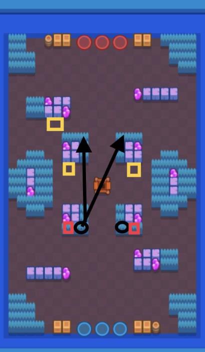 完全对称的一张地图,不存在优劣之分。这图中路压力会很大,边路主要对线区域离中路gc位置非常近。对中路要求很大的一张地图。长射程英雄如佩佩(piper)、潘妮(penny)、洁西(jessie)等中路站在下图黑圈两个位置,以黑色箭头为射击主要方向。如果所选gc为penny,则炮台放置在红框位置。如所选gc为jessie,则炮台放置在黄框位置(最上方黄框为碾压时放置位置)。边路英雄选择多样化,长射程英雄如布洛克(brock)、中近距离nita、仙人掌、胖子、leon、滚筒、leon、tara都能使用。但是在选择对线路线上要注意克制关系。但是这张图边路障碍加草,并不能稳定实现压制,理论上中距离压制近战,但是当你3下攻击都没打到人,只能考虑回退了,因为他会从你射击盲区摸过来了。如果对线崩盘,那么基本中路也要崩。因为上述提过的,对线位置离中路太近,会影响己方中路走位。