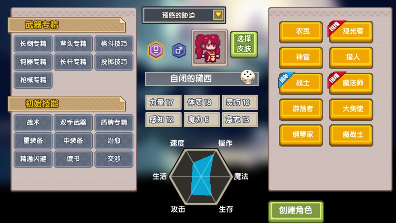 主要属性:战士职业的主要属性就是力量、体质、灵巧、意志,力量的增加是保证战士职业输出伤害的主要途径之一;而体质顾名思义就是增加战士职业的血量上限和血条的恢复速度;属性灵巧应该就是影响着战士职业的闪避概率和攻击频率;意志按照大多数游戏的案例来看就是决定人物各种抗性的关键。