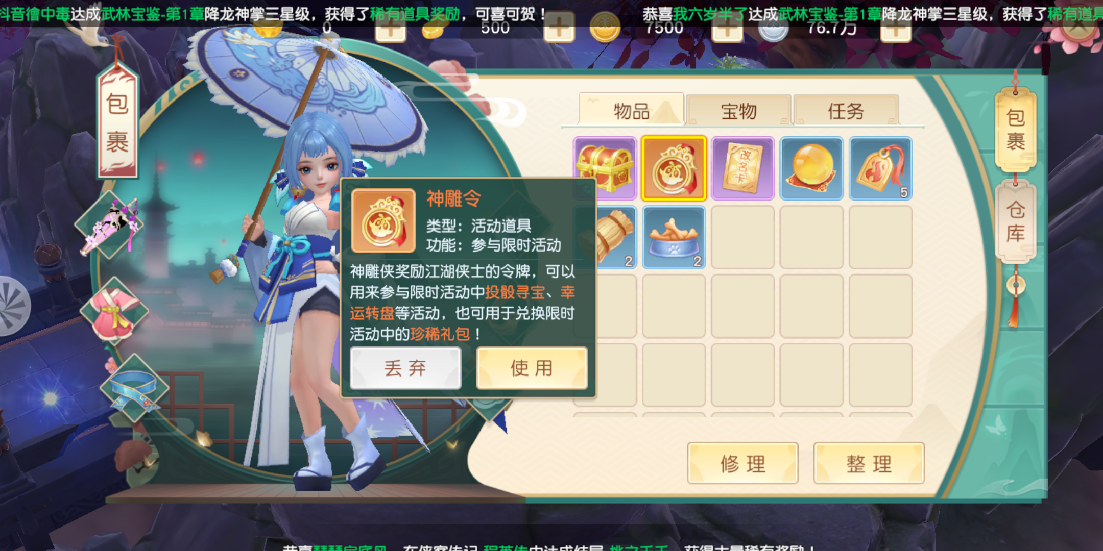 神雕令是可以参与限时活动的道具,使用它可以参加投骰寻宝、幸运转盘等活动,这些活动中玩家朋友们会得到非常多的奖励哦,千万不能错过,另外神雕令还有一个非常重要的作用就是可以换限时活动中的珍稀礼包。