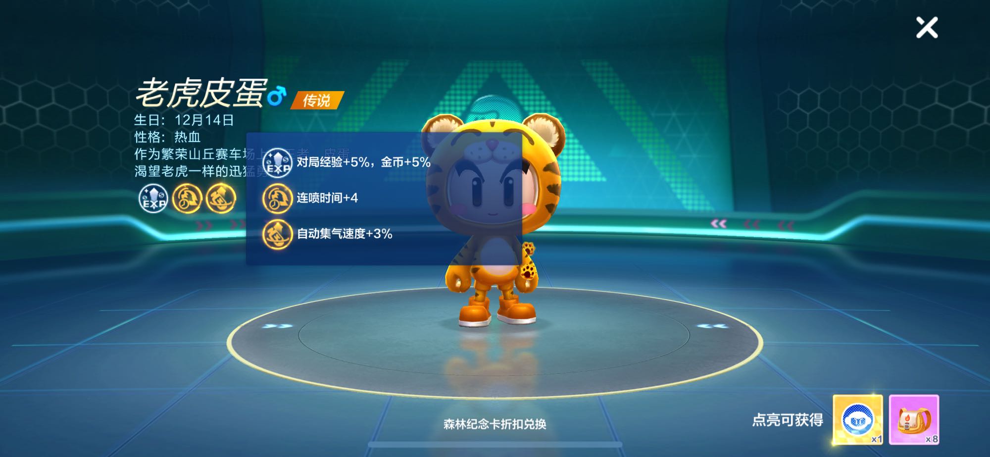 总的来说老虎皮蛋这个角色还是非常不错的,可爱的造型搭配强力的效果,不论是竞速赛还是道具赛都能为玩家朋友们带来优势,想要获得老虎皮蛋有两种方法,第一种是兑换,第二种是直接购买,兑换的话是需要森林勋章这个道具的,可能有玩家们会错过,只要补签就可以了。直接购买要的酷币还是挺多的,各位量力而行吧。
