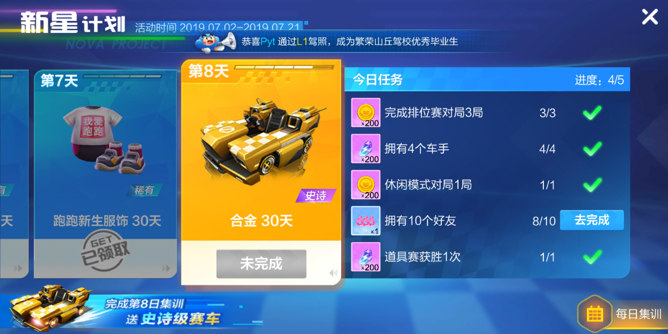 系统每天都会开启一个新的任务,第一天任务完成后会送永久的稀有赛车威龙,第八天开启全部任务完成后可以得到30天的史诗级赛车合金,关键是我们还能获得各种好看的衣服、发型,还有金币和能量水晶可以拿。