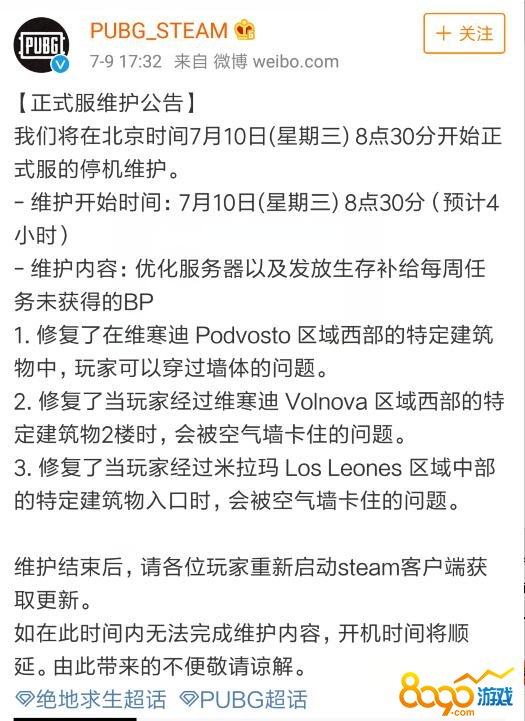 7月10日更新维护从早上8:30开始,预计12:30结束,本次更新主要是进行游戏优化和BUG修复,版本号不变。在7月1日发生的生存补给每周任务出现了重置错误,游戏方也是对此表示诚挚的歉意,所以在7月10日的更新中对7月1日生存不仅发生重置错误的玩家进行BP补偿。发放标准如下: