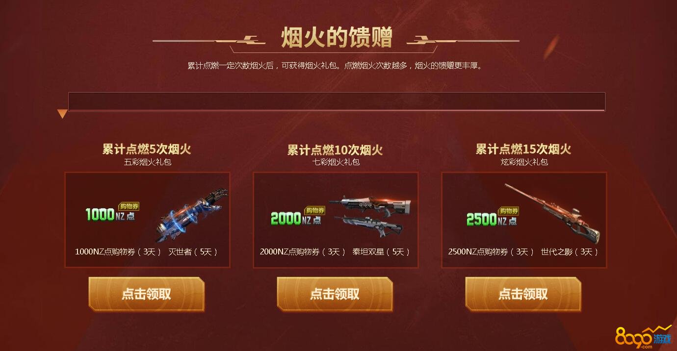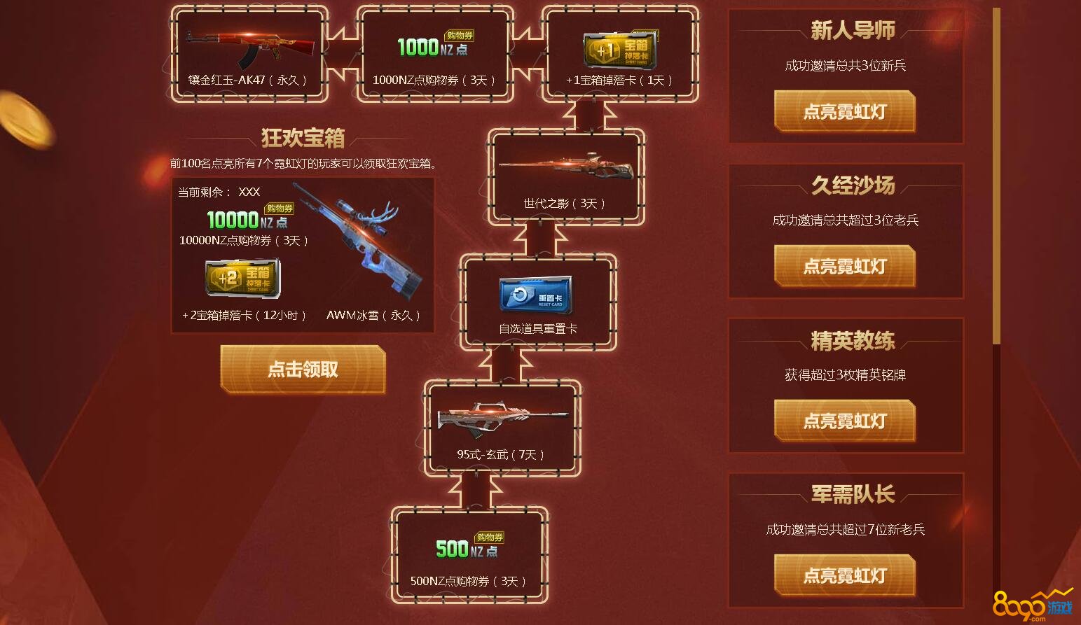 7月盛典夺豪礼活动时间是7月10日至25日,活动期间只要是19年6月1日后登陆过游戏的玩家就可以邀请好友参加该活动了。玩家首次成功邀请就可以获得永久黄金军铲和期限道具,还会幸运附赠永久备胎背包、温科角色、1000点券、2000点券和5000点券其中一款。活动期间玩家完成邀请点亮霓虹灯可以获得大量福利,其中也是包括了自选重置、宝箱掉落卡以及永久镶金红玉-AK47,前100名点亮的玩家还可以额外活动AWM冰雪+10000点券+宝箱掉落卡的狂欢礼包。玩家还可以使用铭牌来点燃烟火的,点燃的同时可以进行福利抽奖,累积点燃更是有多款期限道具以及点券可以领取。
