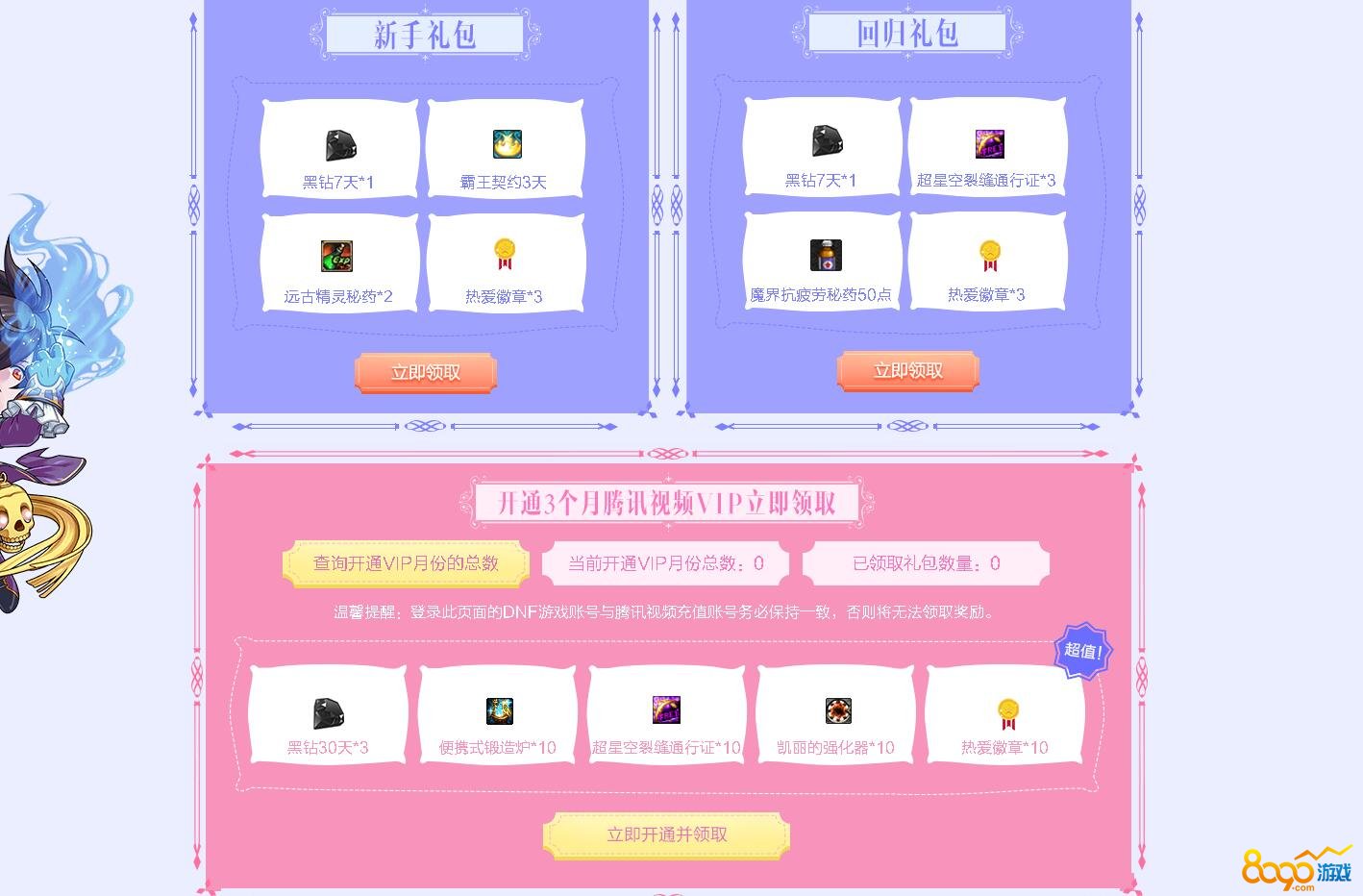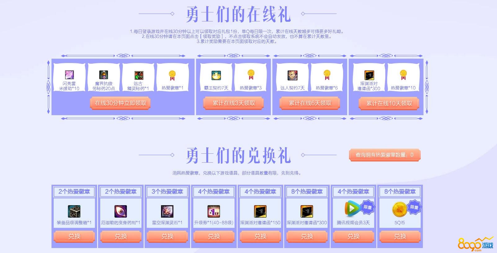 7月热爱好时光活动时间是从7月11日开始,8月31日截止,活动期间内无论你是7月11日之后的新玩家还是6月25日之后未登录的老玩家都是可以领取新老玩家大礼包的,礼包中也是包含了黑钻特权和游戏道具等。活动期间玩家开通3个月TX视频vip就可以获得90天的黑钻奖励以及游戏道具和热爱徽章,开通特权的玩家每天还可以进行抽奖,同时还有在线礼包可以领取,玩家可以使用热爱徽章兑换升级券、品级调整箱等游戏道具和会员特权以及Q币奖励。