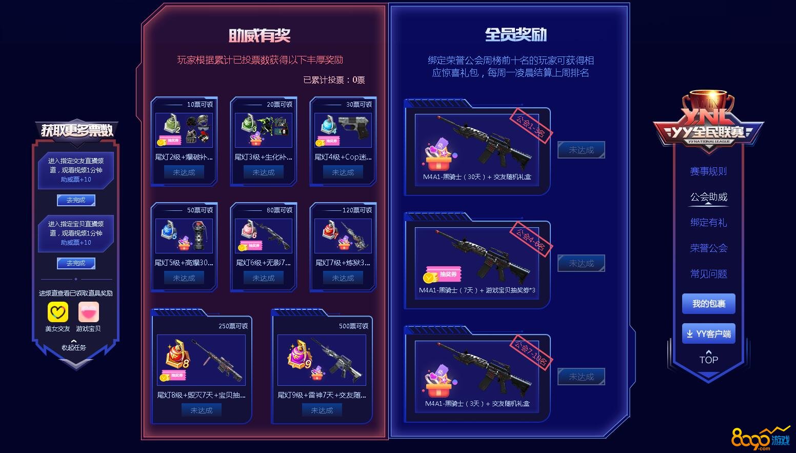 首届联赛杯玩家可以在活动网址进行资格报名,可以以个人或者公会的形式进行报名,7月10日至8月4日期间进行资格争夺赛,该期间玩家可以进行投票助威,玩家可以通过活动任务获得助威票数,同时玩家进行投票可以获得相应票数可获得奖励,奖励也是包括了很多人气期限道具。绑定荣誉公会前十名的玩家还可以额外获得惊喜礼包。玩家在活动期间进行角色和YY公会的绑定,就可以在永久M4A1死亡之翼和永久圣诞手雷中任选一款,绑定之后是可以解绑的,所以玩家绑定时要慎重。