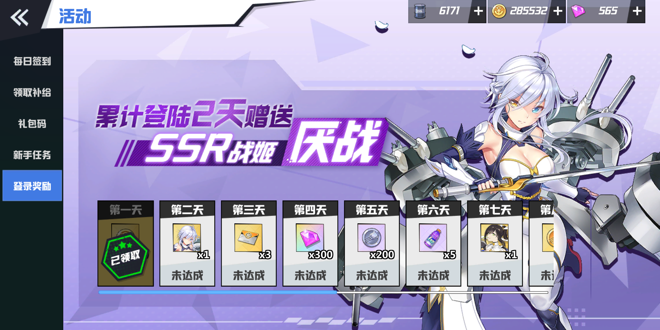 最后一个活动是一定要参加一下的,只要你签到两天就送紫色SSR战姬厌战,第七天也会送一个非常不错的战姬,大家只要每天签到就可以了。今天获得更多船方法就给各位介绍到这里了,喜欢的朋友多多尝试一下吧,相信你很快就能组建出一个专属的强力舰队了。