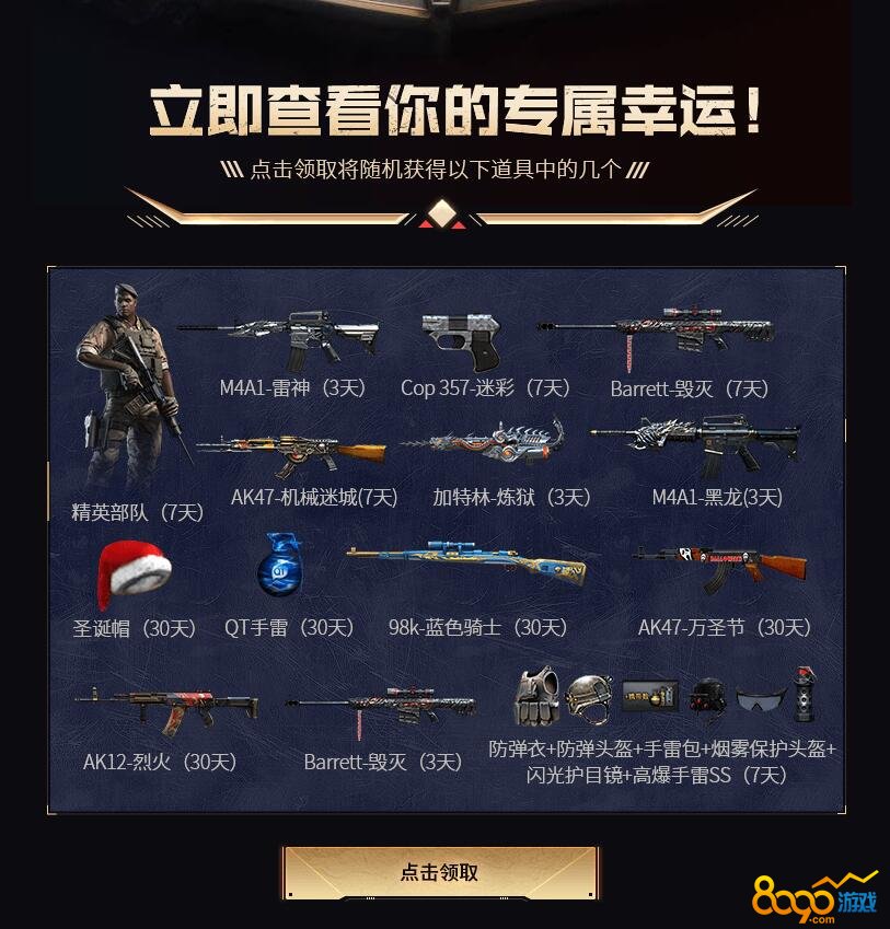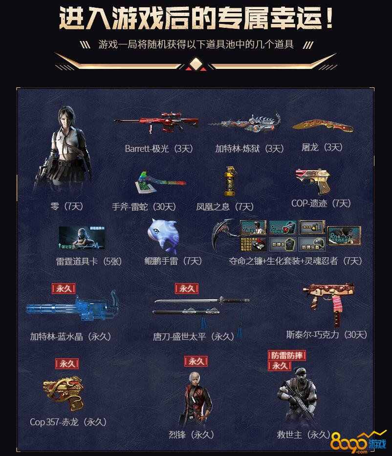 7月专属宝箱待领取活动时间截止到7月31日,该活动是专门为玩家带来的免费活动,玩家在活动页面可以领取自己专属宝箱,打开后会在众多道具中随机获得几个,奖励也是加入了M4A1雷神、巴勒特毁灭、M4A1黑龙等多款人气道具,虽然都是有期限的,但是对于免费获得还是很不错的。除了专属宝箱之外,玩家在活动期间进行游戏还可以领取自己的专属奖励,奖池中除了一些期限道具之外更有永久加特林-蓝水晶、唐刀-太平盛世、COP257-赤龙、烈锋和救世主,这几款奖励都是永久的哦!