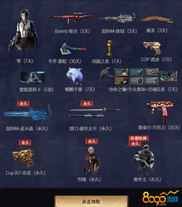 本次活动时间是整个七月,点击领取就可以获得以下道具的其中之一,各种枪支皮肤,有m4a1,cop357,barrett,ak47,加特林,m4a1,qt手雷,98k,ak47,ak12,还有防弹衣,防弹头盔,手雷包,烟雾保护头盔,闪光护目镜,高爆手雷等,游戏一局之后就能获得以下的道具之一,