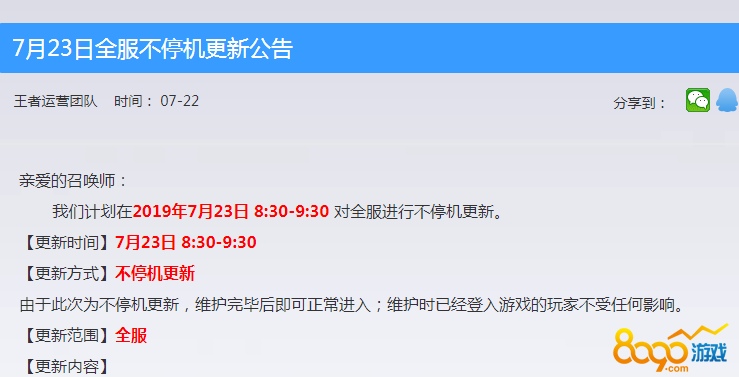 本次更新时间是2019年7月23日上午 8:30-9:30,本次更新为不停服更新,也就是说,在维护更新期间已经进入游戏的玩家不会受到影响,维护结束之后玩家可以正常登入游戏,本次更新的范围是全服。更新的内容有关于夏日福利,以及限定的皮肤,雅典娜-神奇女侠7月26日限时返场,芈月-大秦宣太后品质升级完成,明天更新结束后各位玩家就能见到。此外还有积分夺宝,体验卡兑换等活动,感兴趣的玩家记得多多关注官方消息,不要错过喔~