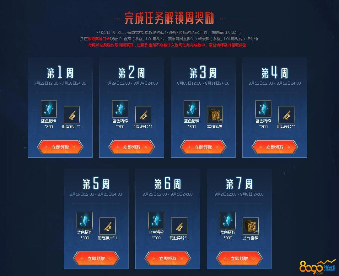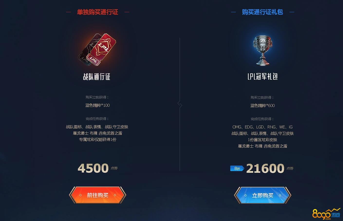 2019LPL战队通行证的出售时间是7月22日12:00至9月8日12:00,通行证分为战队通行证和冠军礼包,单独购买通行证的玩家可以立即获得100蓝色精粹,完成任务可以获得战队图标、战队表情、战队守卫皮肤以及屠龙勇士布隆赤角龙兽之盾专属炫彩一个,购买LPL冠军礼包的玩家可以获得600蓝色精粹、6支战队图标+表情+守卫,以及布隆的专属赛区炫彩,活动期间玩家是可以购买多支战队的通行证,就可以获得对应战队的图标等奖励了。战队通行证一共有7周的任务,玩家完成任务就可以获得蓝色精粹、钥匙碎片、杰作宝箱等奖励了,玩家只需要每周完成5局比赛,在领取当天观看LPL直播或者录像15分钟就可以领取每周奖励了!