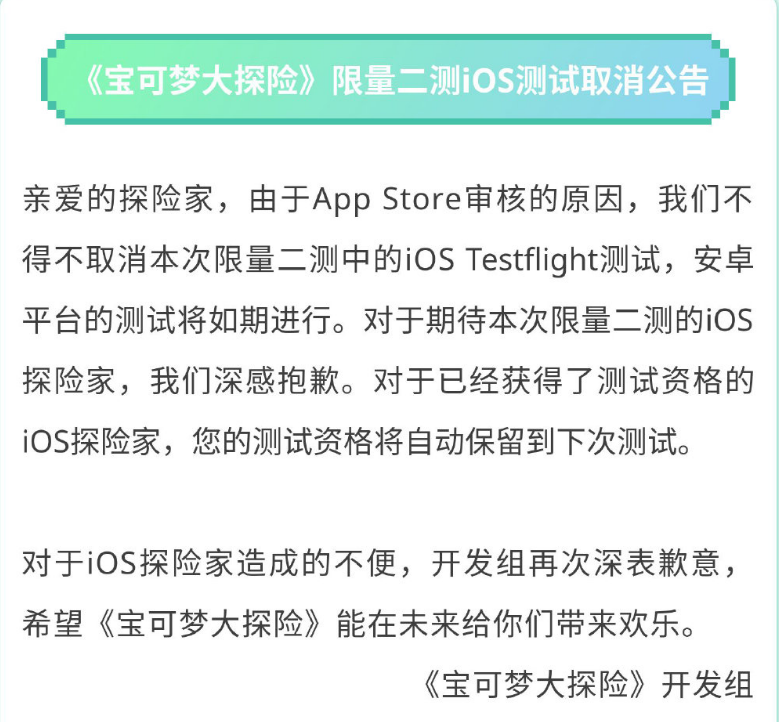 亲爱的探险家,由于App Store审核的原因,我们不得不取消本次限量二测中的iOSTestflight测试,安卓平台的测试将如期进行。对于期待本次限量二测的iOS探险家,我们深感抱歉,希望《宝可梦大探险》能在未来给你们带来欢乐。