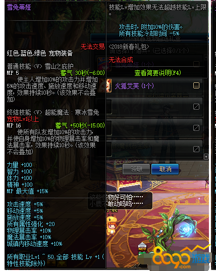 2018春节礼包是兽人主题,那一年的春节宠物一个叫雪兔一个叫火狐,除了外观属性是一模一样的,主要属性有100四维,20属强,1-50技能+1,10%白字和5%减CD。