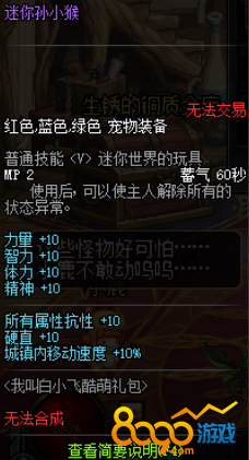 下面就是属性加成以及外观的介绍,DNF迷你孙小猴属性:普通技能是迷你世界的玩具;属性加成是四维属性+10;所有属性抗性+10;硬直+10;城镇内移动速度+10%。