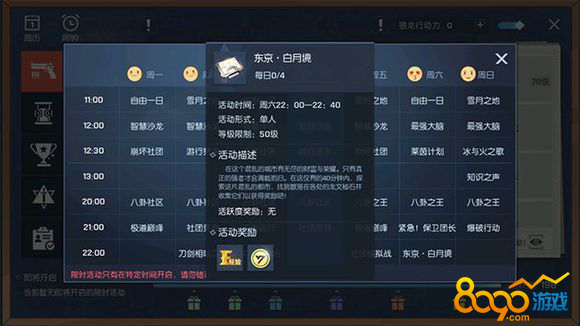 首先是关于开放时间,东京白月境的开放时间是周六晚上的十点,等级达到五十集就可以参与,,进入方式是在活动内直接点击参与就行了,之后会到一个NPC对话处。