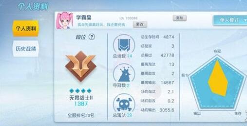 到后面你会遇到越来越多的大神玩家,对自己实力提升有不少的帮助哦。现在来给大家说几个冲分的小技巧,在新兵段位大家是不会掉分的,只会涨分所以只要每盘好好打就可以了。到了1200分之后不论在单人、双人还是五人模式,只有进前25名或是前10名才能加分。最后提醒大家一点,在游戏中击杀敌人算的分数并不是很多,所以生存下来提高名次才是最关键的哦。