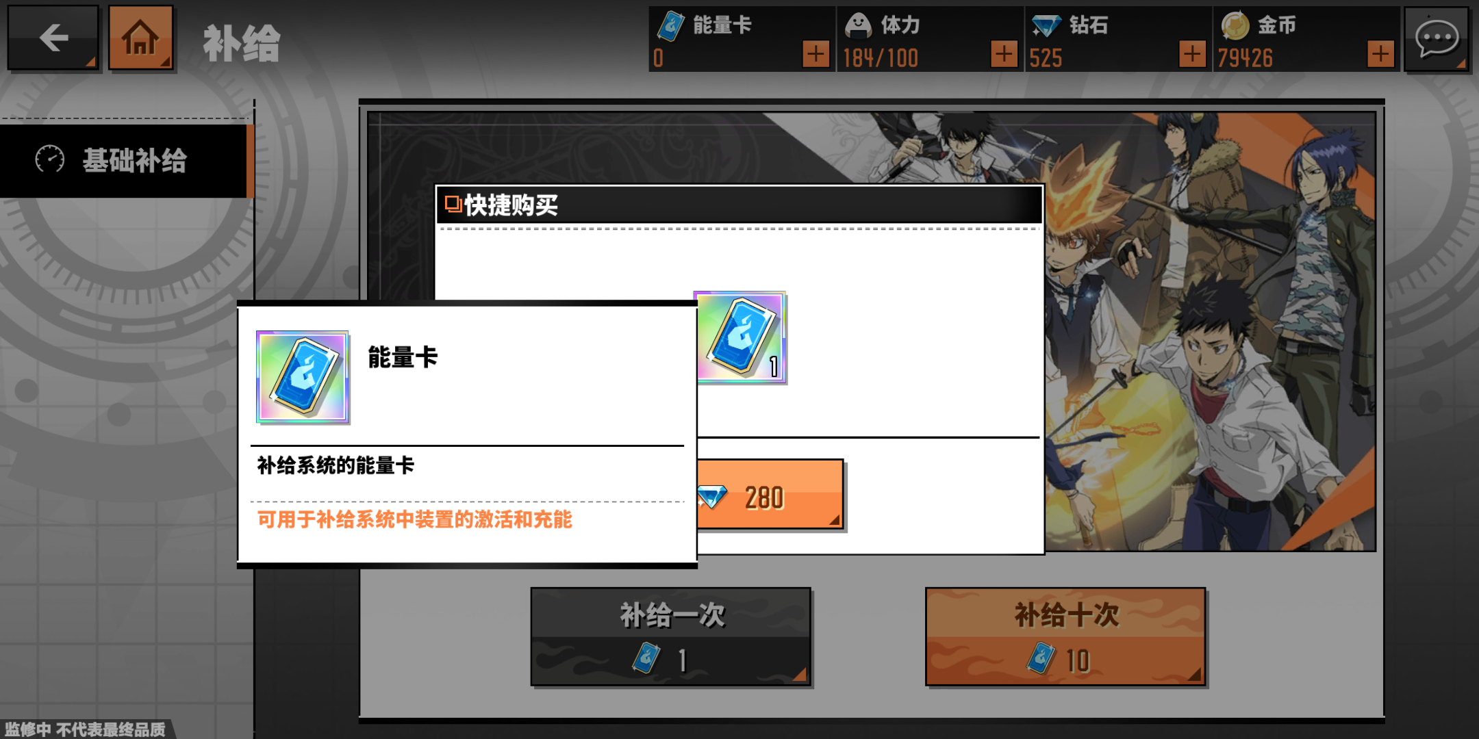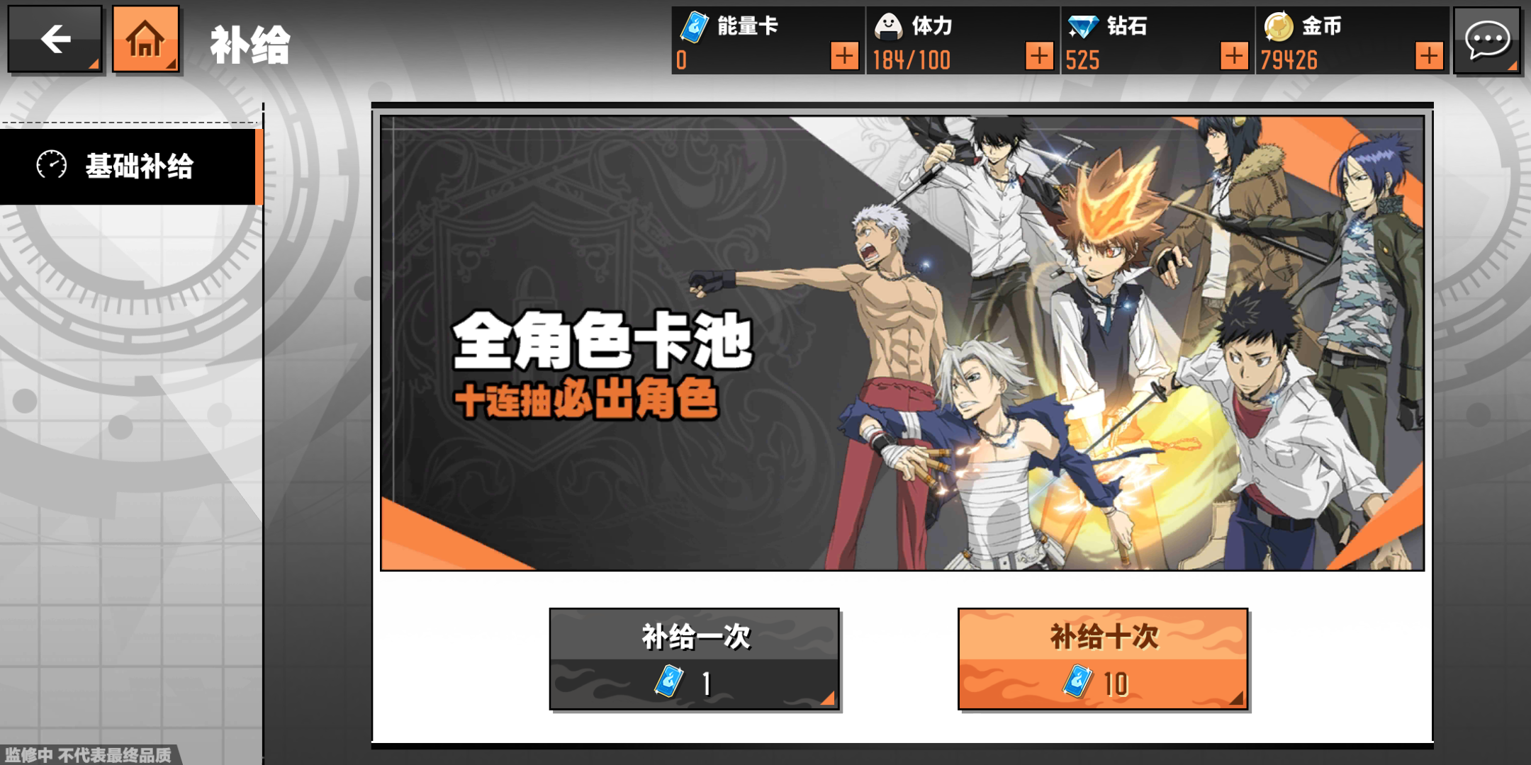 玩家们可以通过补给来获得各种各样强力的角色,但是想要抽到自己喜欢的角色也不是那么容易的事情哦,需要使用到能量卡这个道具,一张能量卡的售价是288钻石,可以选择十连抽或单抽,十连抽要便宜一点价格是2800钻石。