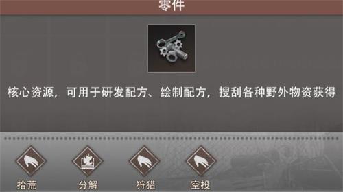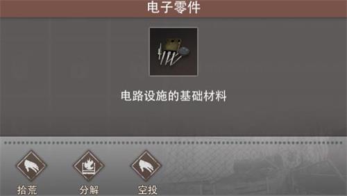 2、电子零件是一类珍贵的材料,玩家可以通过野外工具箱、补给箱、军火箱、高级补给箱、分解机分解成品、空投概率入手。其中,空投一般不推荐采用,除非有团队和装备的支持,否则有概率被人黄雀在后;