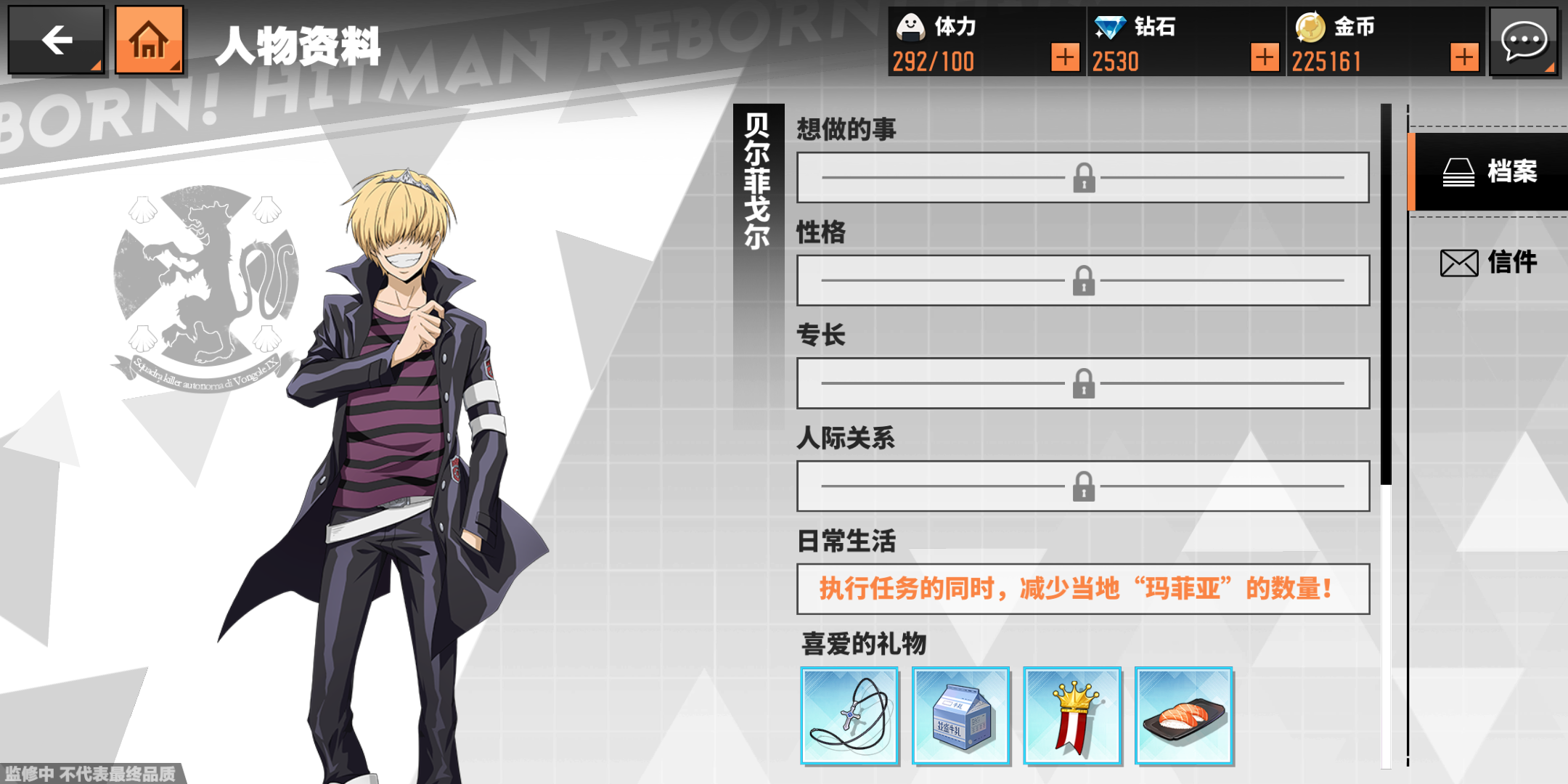 这个角色喜欢的礼物有男士项链、并盛牛奶、小王子胸针、三文鱼寿司,这些东西每个可以增加40的信赖度,获得方法也非常简单,我们只需要去后宅系统中的扭蛋机里抽取就可以了,当然能不能抽到以上的礼物还是要看运气的,另外建议玩家朋友们同时培养几个角色比较好,这样就不会发生偏科的情况,当然在攻击敌人的时候切换角色也能打出各种不同连招哦。