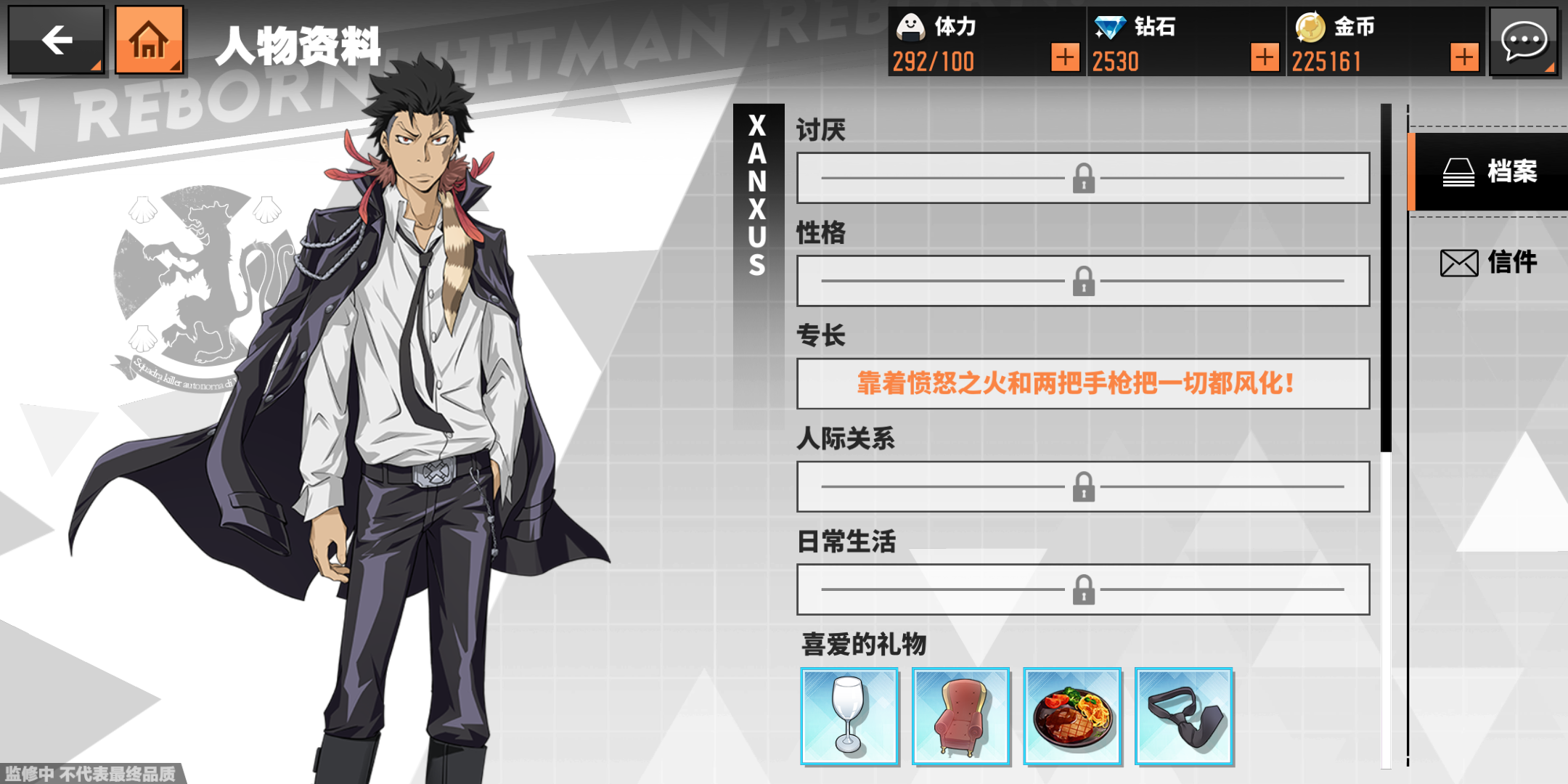 XANXUS喜欢的东西有精致的红酒杯、沙发、菲力牛排、领带,大家如果平时获取到了这些礼物可以送给他,获取礼物的方法也很简单,只需要去后宅系统的扭蛋机中抽取就可以了,至于能不能抽到这个角色喜欢的礼物还是要看运气哦。建议搭配平时在培养角色的时候可以几个角色一起培养,这样不会出现偏科的情况,在战斗中切换不同的角色也能应对不同的敌人。