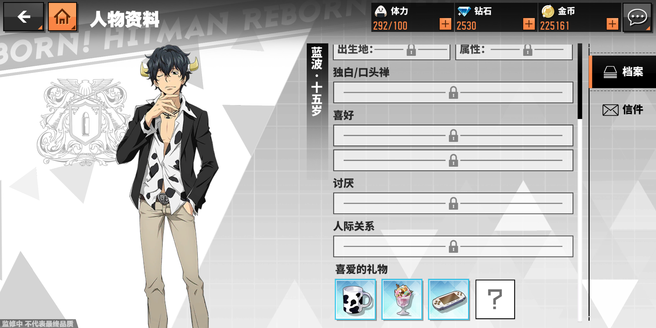 蓝波喜欢的东西有奶牛马克杯、意式手工冰淇淋、掌机,送出这些礼物后随着信赖度的提升,玩家们还能解锁蓝波新的资料,当然礼物这个模块也能解锁更多。想要获得礼物大家可以去后宅系统中的扭蛋机中抽取,至于能不能抽到你喜欢的礼物就要看运气咯。今天家庭教师蓝波送礼攻略就给玩家们介绍到这里,之后我们会带来更多不同角色喜欢的礼物,大家多多关注哦。