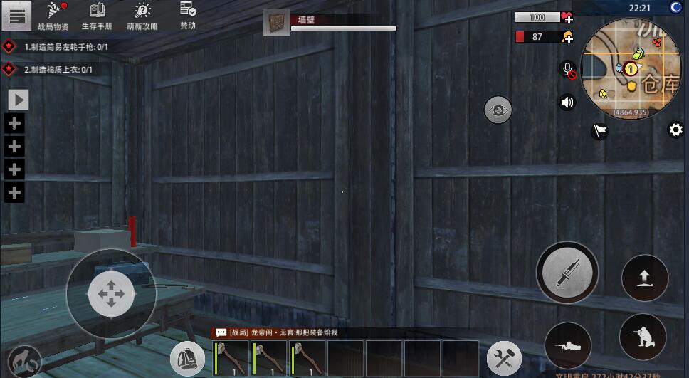 那就是玩家组我解脱之后,会把血量回复满,饥饿度回复100,然后在在战局系统还会送玩家一把石斧,所以小编就突然觉得完美可以在血量不满也没有治疗道具的情况下用这种方法。当然了,这种方法一定要在自己的家里使用,这样才不会让其他玩家吧你死后的物品捡走。
