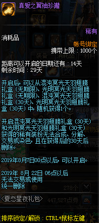 DNF七夕真爱之翼袖珍罐这个真爱之翼袖珍罐是之前的活动时候购买999的夏恋星夜礼包获得的,总共就只有2个,也就是说仅有两次机会可以开出天空装扮,当然这个是有几率的,能不能开出永久的只能看运气了。