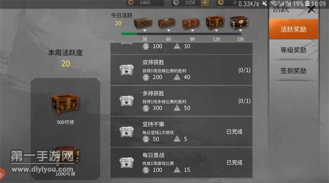 1、酣战沙场,每天完成3场游戏比赛可以获得20活跃度和100经验值