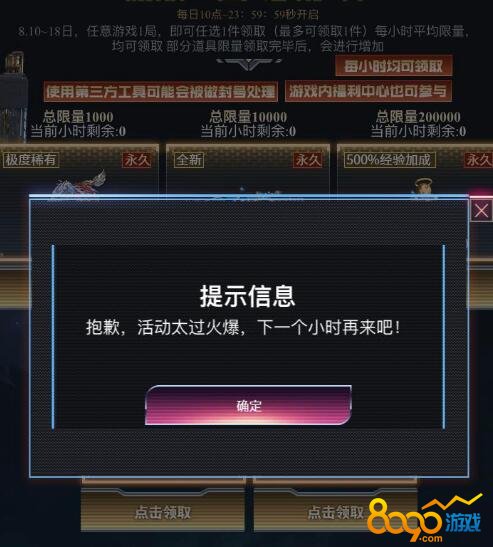 很多玩家在进行抢领的时候几乎都抢不到,要么就是系统提示“抱歉,活动太过火爆,下一个小时再来吧”,确实玩家想要抢比较好的道具除了运气之外,还有一点点小技巧。玩家们都知道在进行抢的时候会需要有一个安全码的验证,这个设置恰恰是为了保护众多玩家的权益,防止不法玩家使用插件进行抢领。其实玩家可以在59分的时候就将安全码弄到快成功的位置,等到一到0点或者差一两秒的时候就完成验证码,这样有很高的概率可以获得。