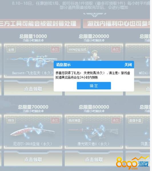 8.10周年庆特别篇活动时间是8.10至18日,玩家只要进行一局游戏,就可以在10款奖励中选择一款,目前比较抢手的就是御龙戒、巴雷特-飞龙在天、天使玩偶、M82A1-翔龙和COP-赤龙了,玩家再不济也会选择手斧-雷蛇、2018圣诞尼泊尔和激光毁灭者,但是还是有很多玩家想试试运气看看能不能抢到比较好的道具,那么8.10周年庆特别篇怎么才能抢到奖励呢?