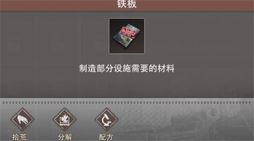 D、铁板:5精铁锭、30零件制作;分解机分解,亦可采用野外敲油桶的方式获取。