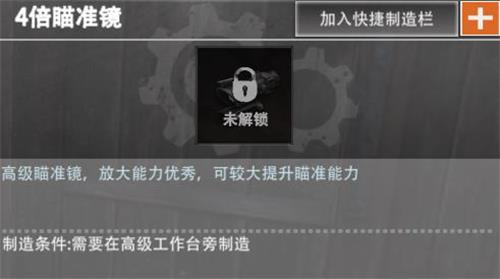 4倍镜,最珍贵的道具之一,有着极高的实战价值,制作材料及功能如下: