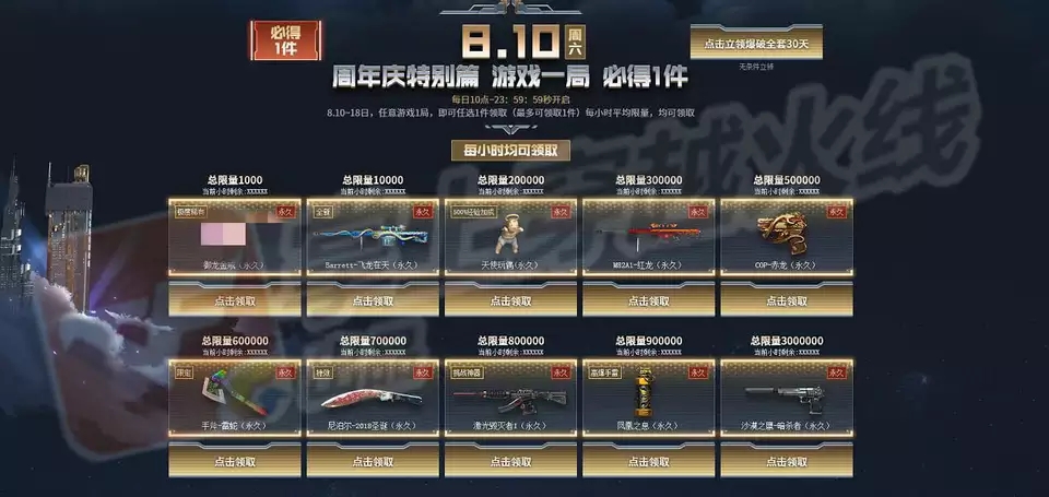 8月10日,cf11周年庆,只要在8月10日-8月18日完成一局对战。就可以领取任意一件稀有永久道具。