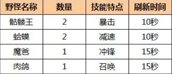 游戏开始过后的3秒野怪就会刷新,每个野怪的数量以及技能特点都是不同的,野怪的刷新时间大家可以参考上图,最慢的是15秒,最快的是10秒就可以刷新。